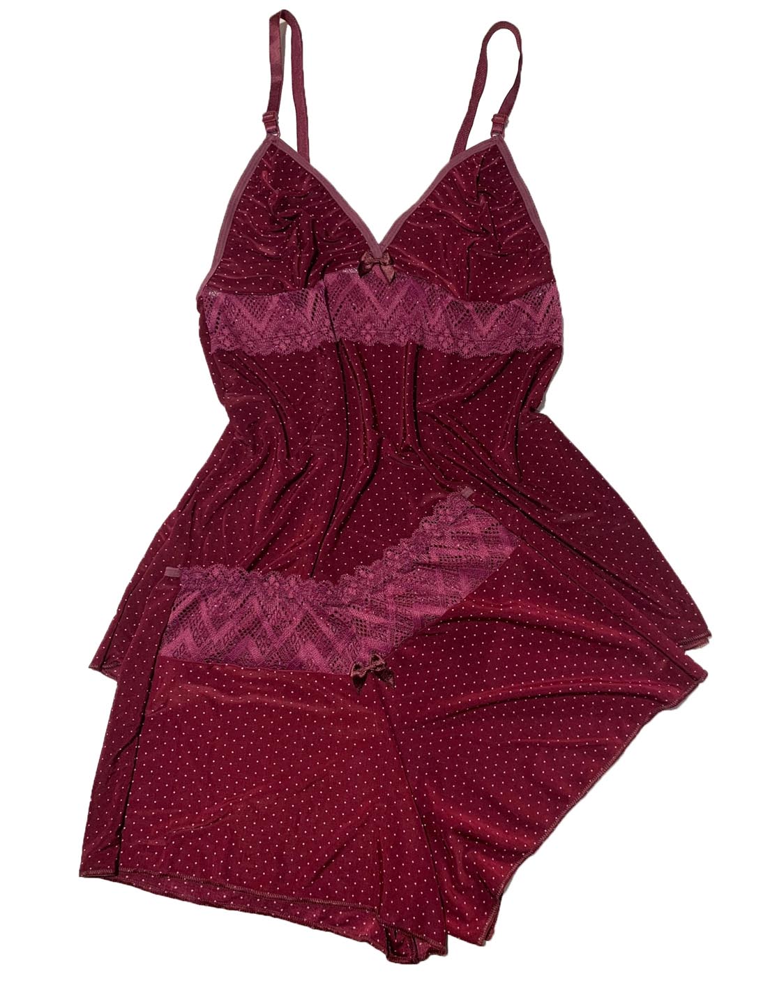 Baby Doll fabricado em microfibra estampada de políester de alta qualidade com detalhes em renda. O short em microfibra com detalhe em renda no cós da parte da frente com detalhe de lacinho.