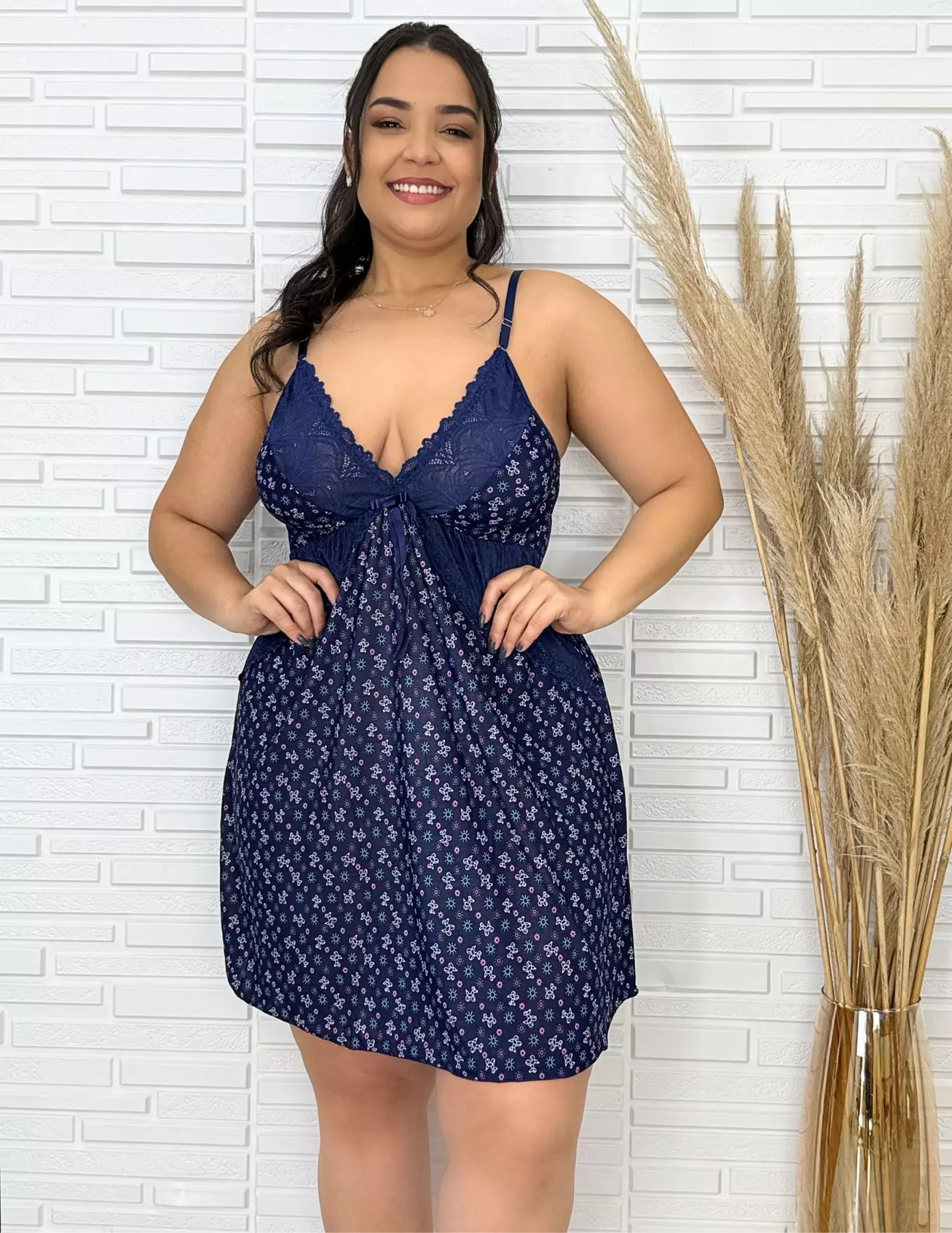 Confeccionada em liganete estampada, um tecido conhecido por sua maciez e caimento fluido, essa camisola plus size se adapta naturalmente ao corpo, garantindo liberdade de movimentos durante toda a noite. O detalhe em renda aplicado no bojo acrescenta um toque delicado e romântico, transformando a peça em algo muito além de um simples item de dormir. As alças fixas com regulagem permitem ajustar o tamanho de acordo com a preferência, oferecendo sustentação e segurança na medida certa.