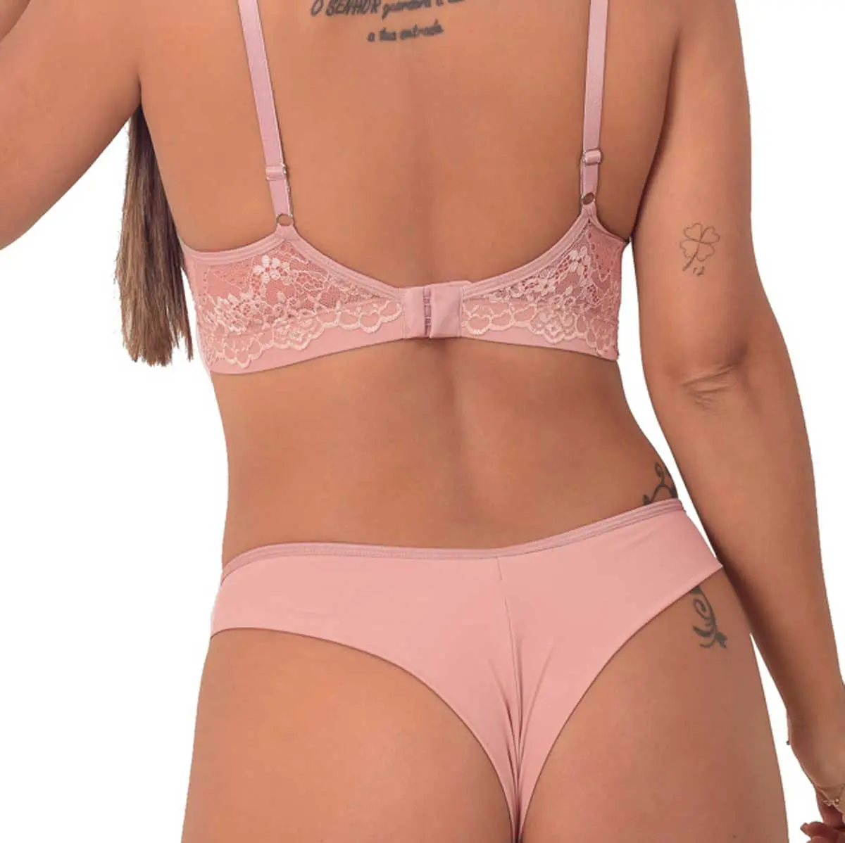 Conjunto de Lingerie confeccionado em Poliamida com Renda. O sutiã com bojo possui aro, alças reguláveis em metal, fecho duplo e laço de cetim gravatinha. A renda é sobreposta em todo bojo, passando pelas laterais até o fecho. Abaixo possui elástico largo macio.