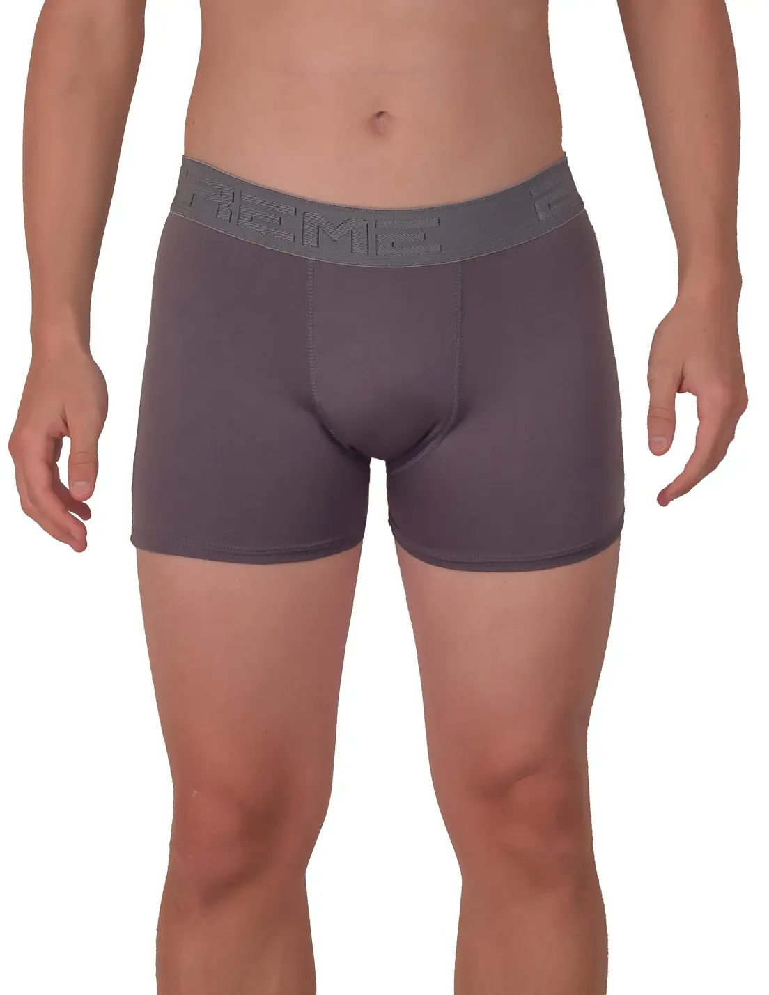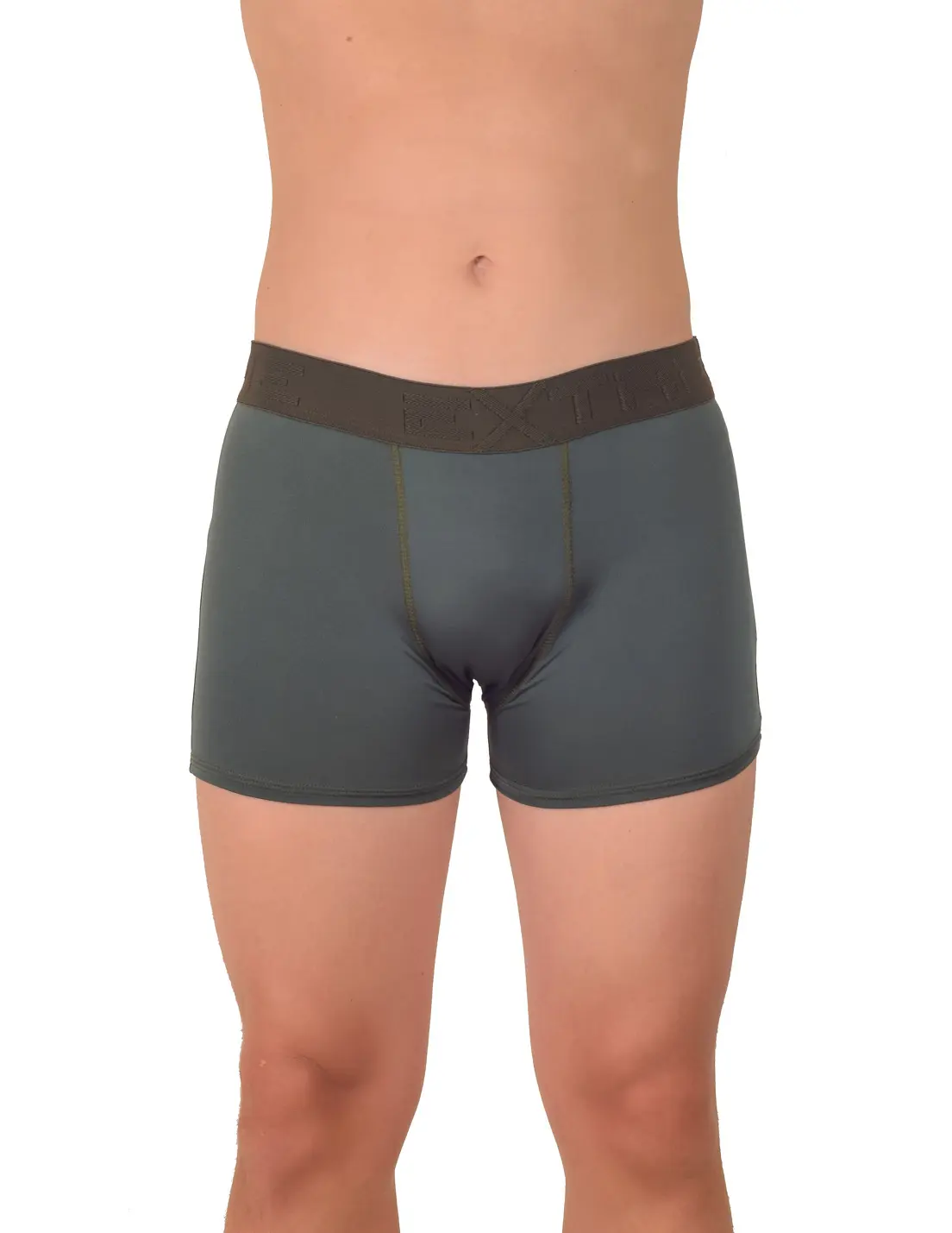 Cueca boxer juvenil confeccionada em microfibra lisa com elástico largo na cintura e detalhes em costura sobreposta na frente.