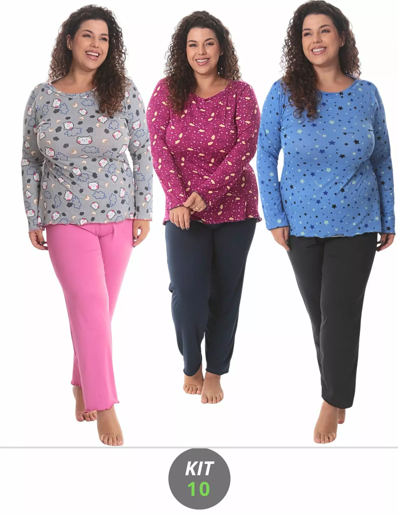 Este kit foi pensado para atender mulheres que buscam conforto sem abrir mão do estilo. Com um design moderno e elegante, o pijama feminino plus size inverno possui mangas longas e calças compridas, mantendo o corpo aquecido durante as noites mais geladas. A modelagem soltinha proporciona liberdade de movimento, permitindo que suas clientes se sintam à vontade durante o sono.