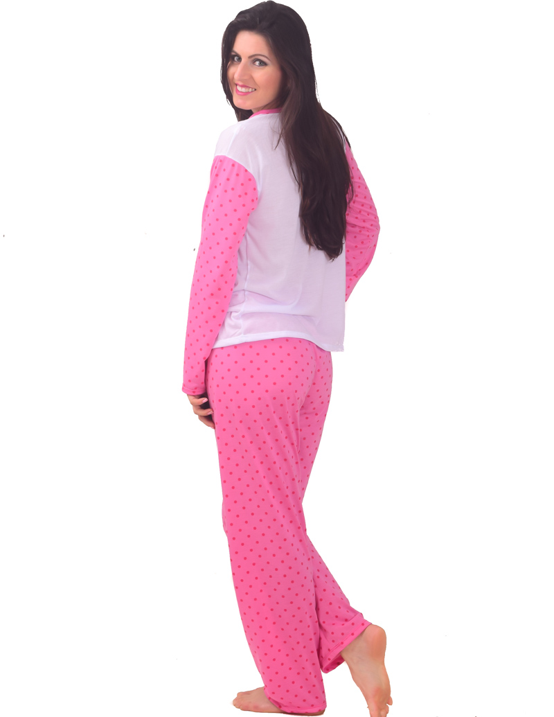 Pijama inverno feminino em malha lisa na frente e estampa e as mangas e a calça em poá. A calça em malha poá sempre na mesma cor do detalhe da blusa, com elástico largo embutido na cintura e bainha nas pernas.